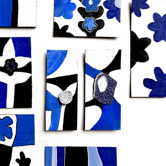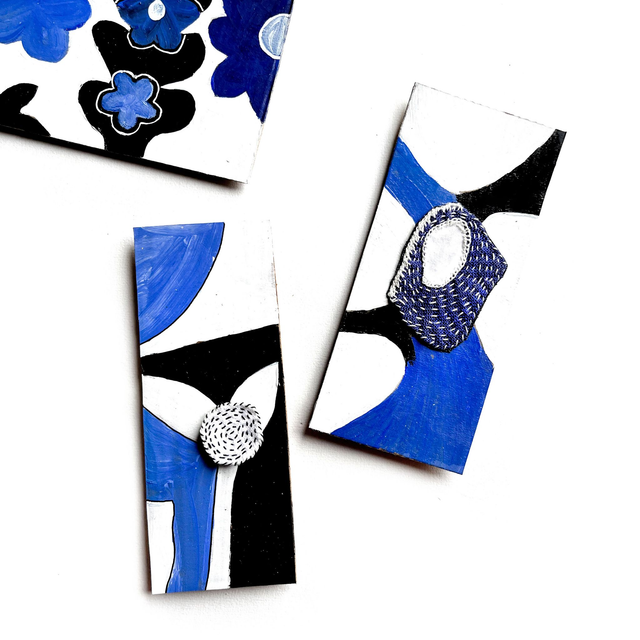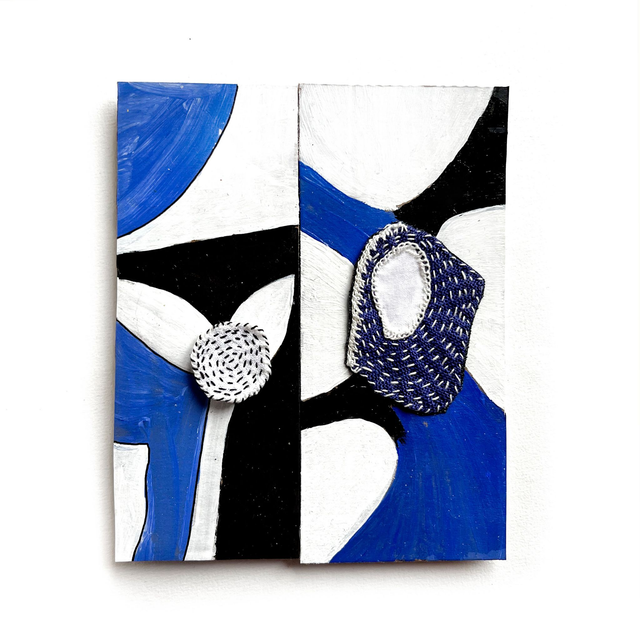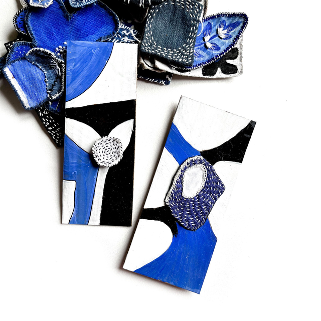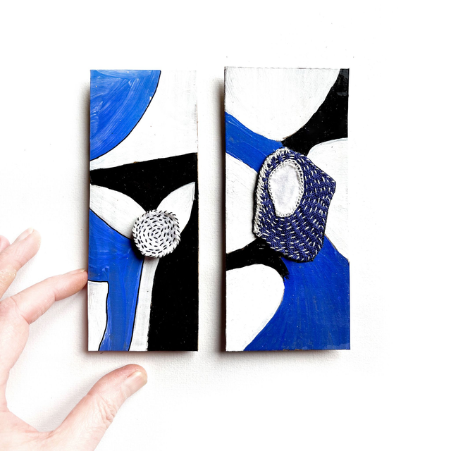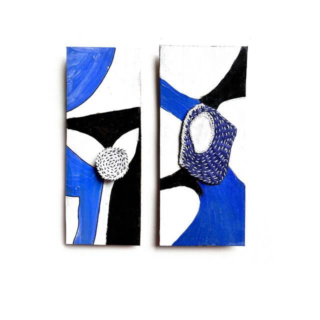 2 tableaux peints sur du carton : blanc bleu roi et noir. Chacun est orné d’une broderie réalisée façon sashiko.