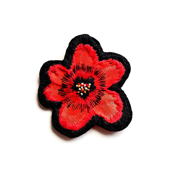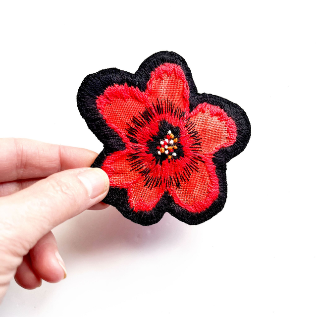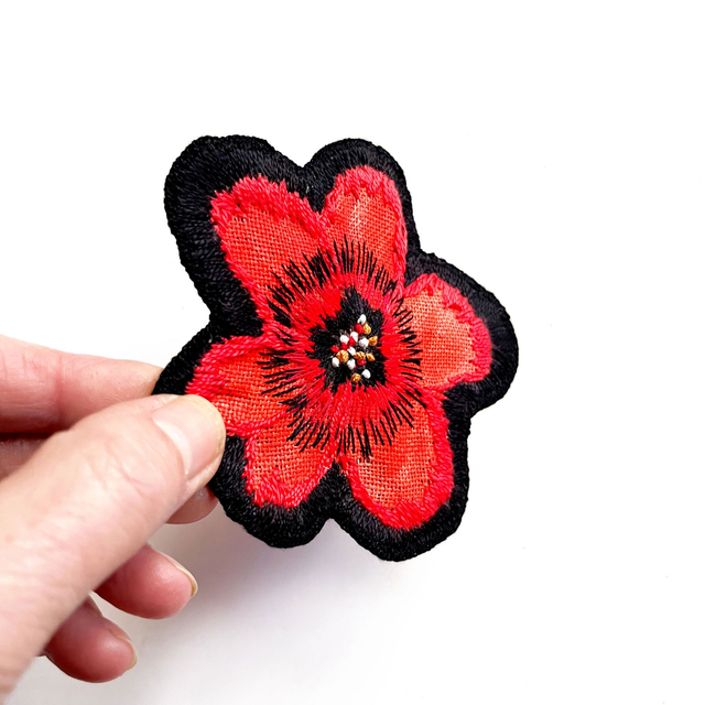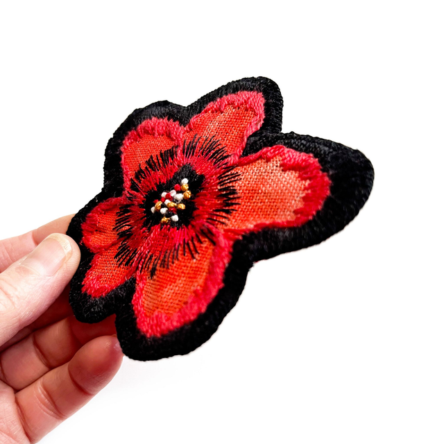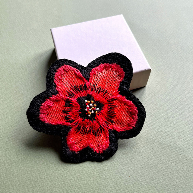 Broche fleur rouge brodée sur lin, pièce unique