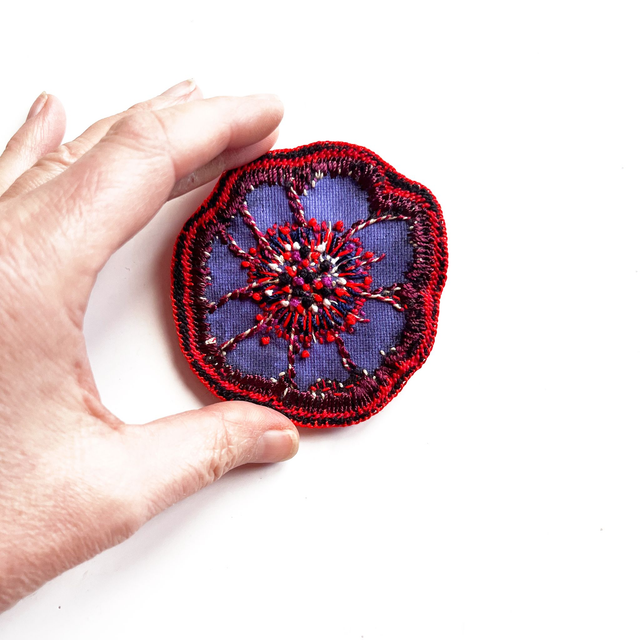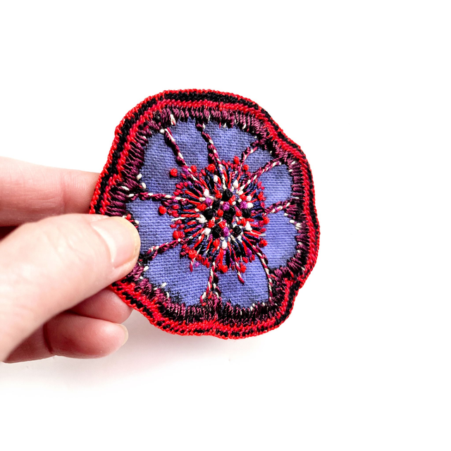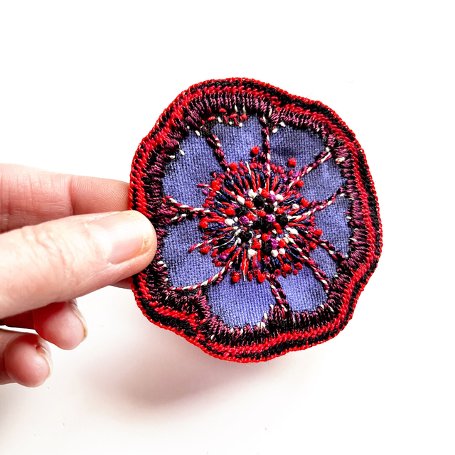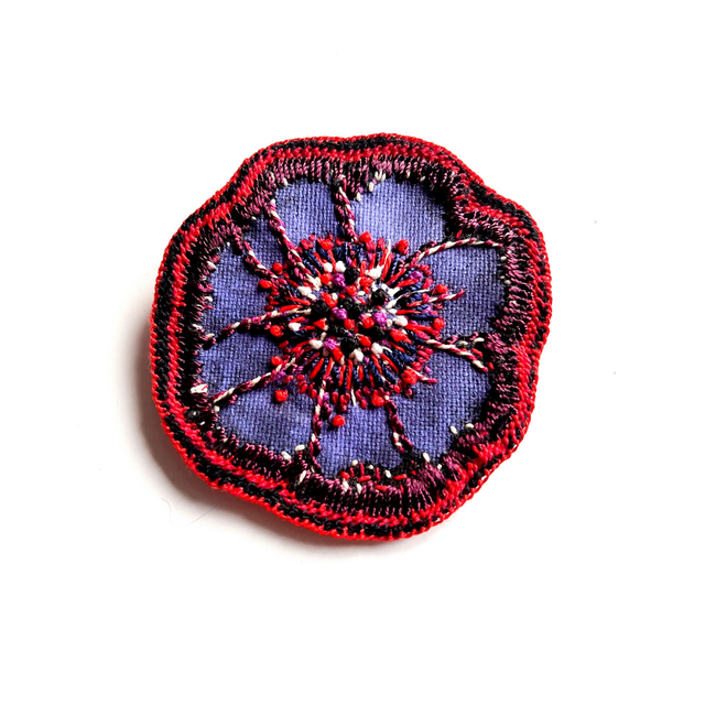 Le cœur de la fleur ainsi que les pistils sont brodés avec des points de nœud dans différents coloris.