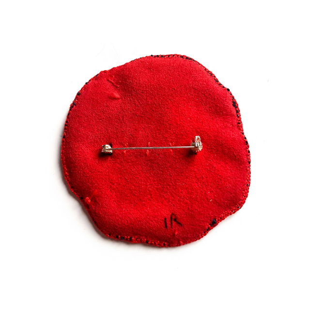 Le motif est peint sur une toile noire en violet foncé et reborde avec des fils de coton rouge, violine, bordeaux et noir.