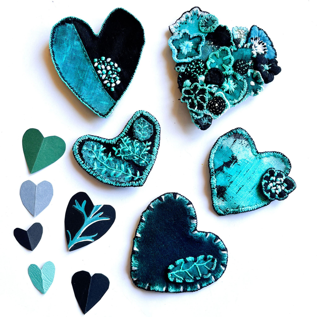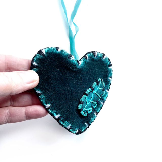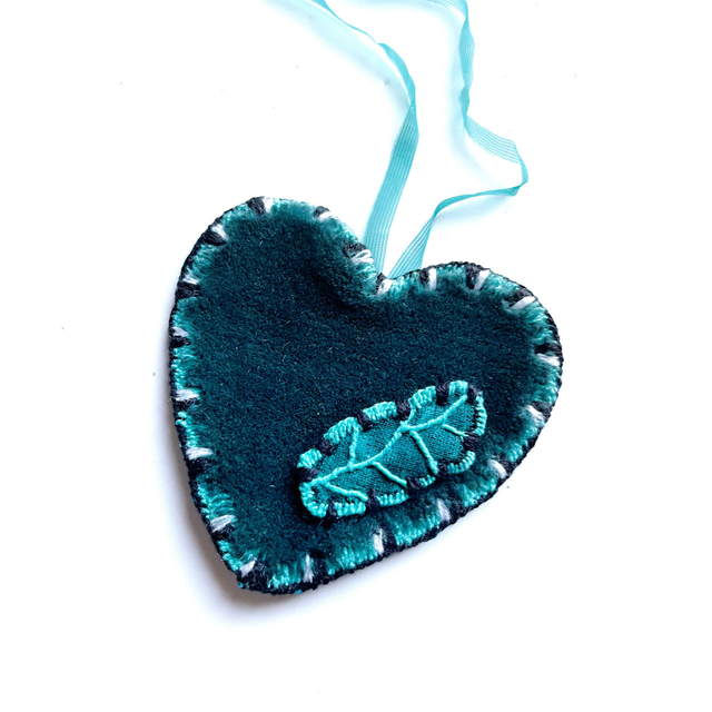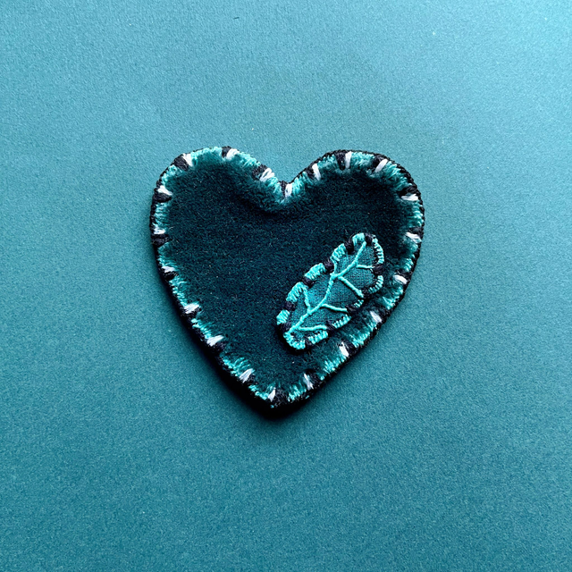 Cœur réalisé sur du velours vert turquoise foncé. Une feuille peinte puis brodée sur du lin est appliquée sur le cœur.
