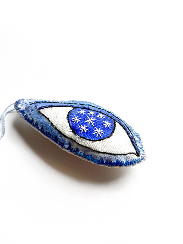 - Différent points sont brodés sur la pièce avec du fil bleu. Les contours de l’œil sont soulignés avec du fil noir.