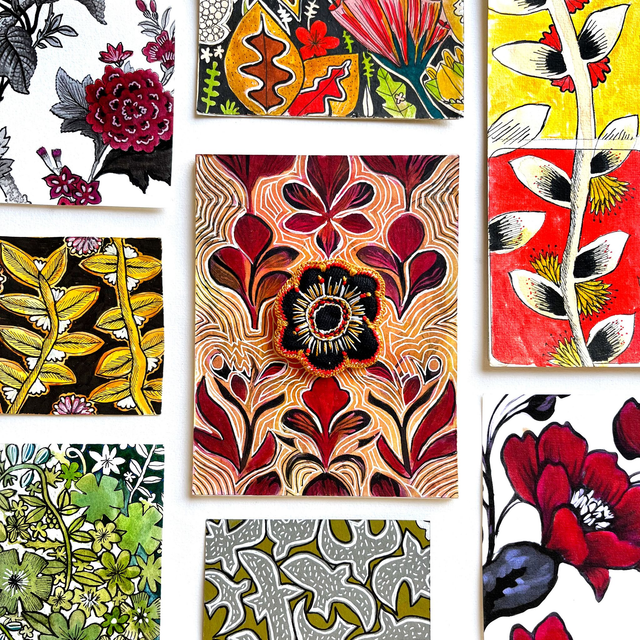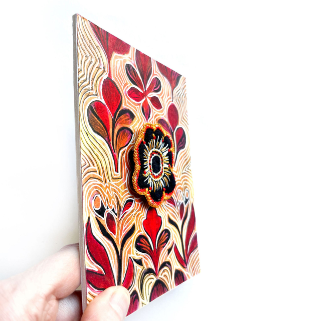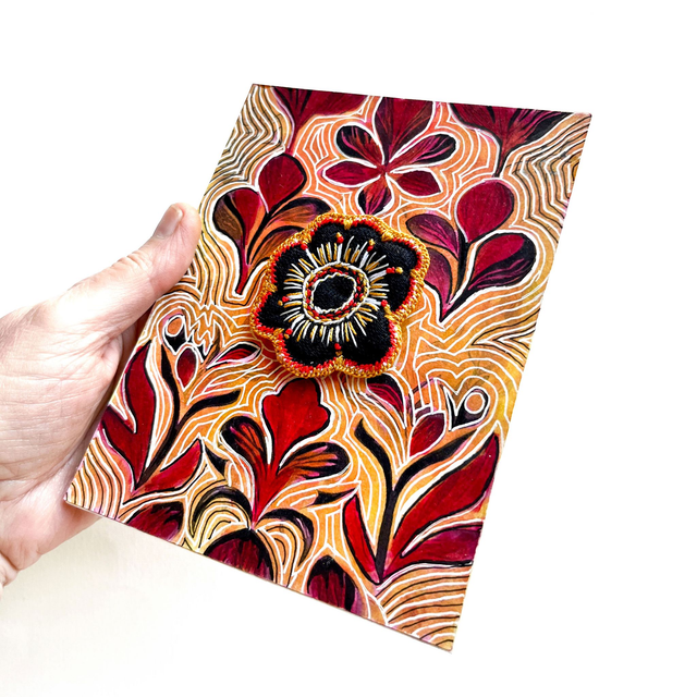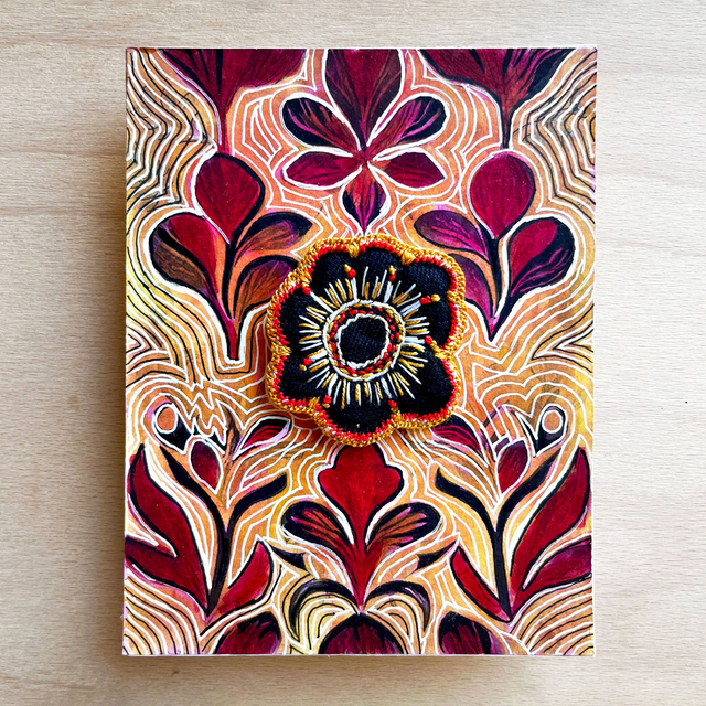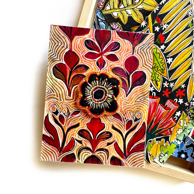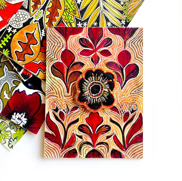 Tableau peint à l’encre à motifs végétaux rouges et orangés. Une fleur brodée sur une toile noire avec des fils de coton jaune d’or, rouge et blanc est appliquée sur l’illustration.