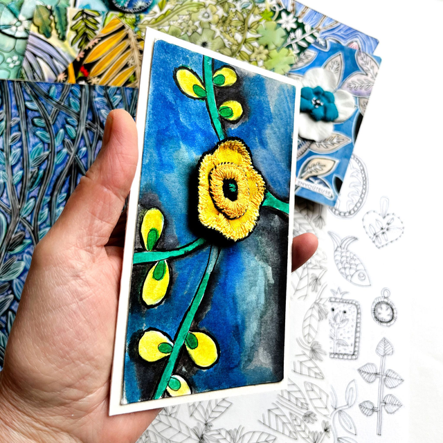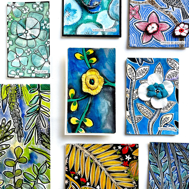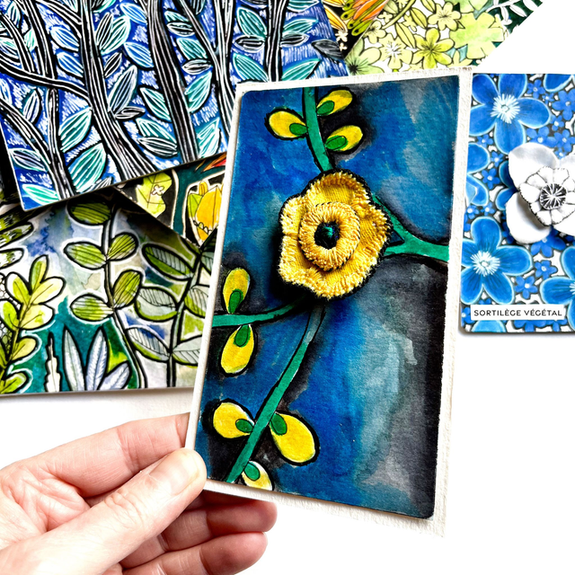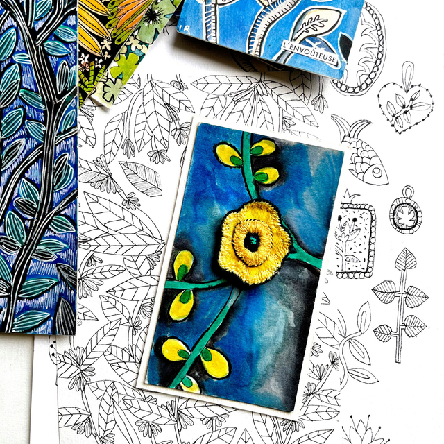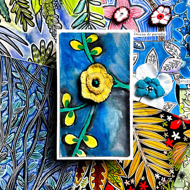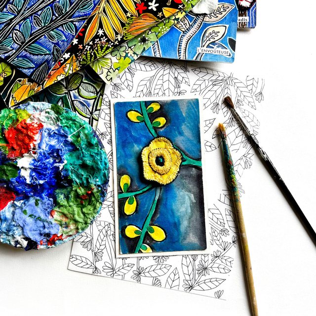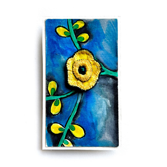 Petit tableau peint à l’encre, au feutre et à l’acrylique représentant un branchage vert et jaune. Une broderie fleur est appliquée sur le tableau.