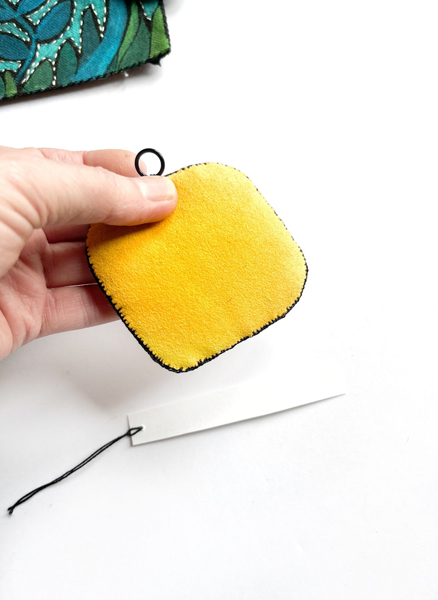 • La pièce est bordée de points de feston avec du fil jaune et du fil blanc.