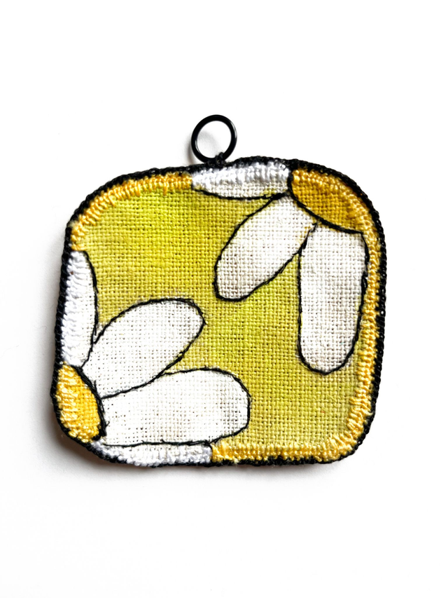 Mini-tableau brodés de 2 pâquerettes recadrées sur les pétales. Les fleurs sont peintes sur du lin : les pétales en blanc, le cœur des pâquerettes en jaune.