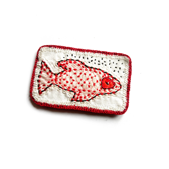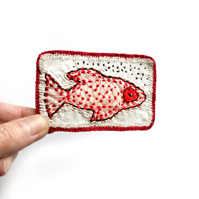 Le poisson est préalablement tracé sur le lin avec un feutre rouge et les écailles sont soulignées avec des points de nœuds et du fil rouge.