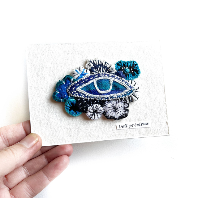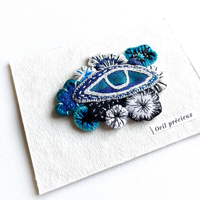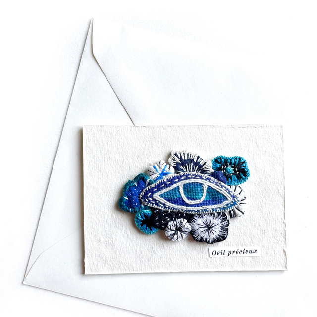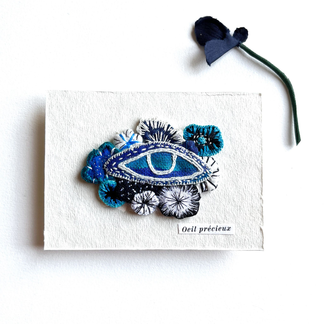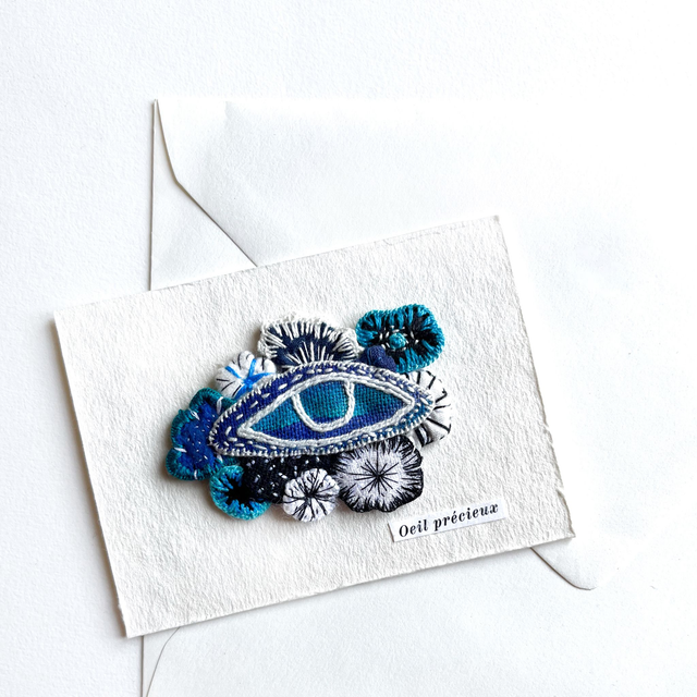 Œil fleuri peint et brodé, appliqué sur carte en papier artisanal