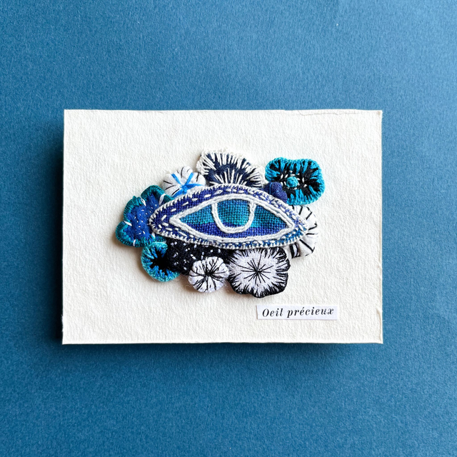 Carte avec un œil fleuri appliqué. L’œil est peint sur du lin et rebrodé par endroits.