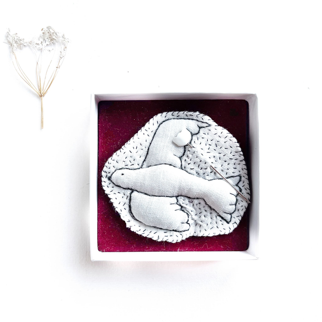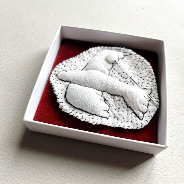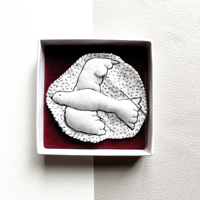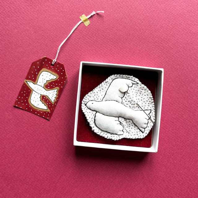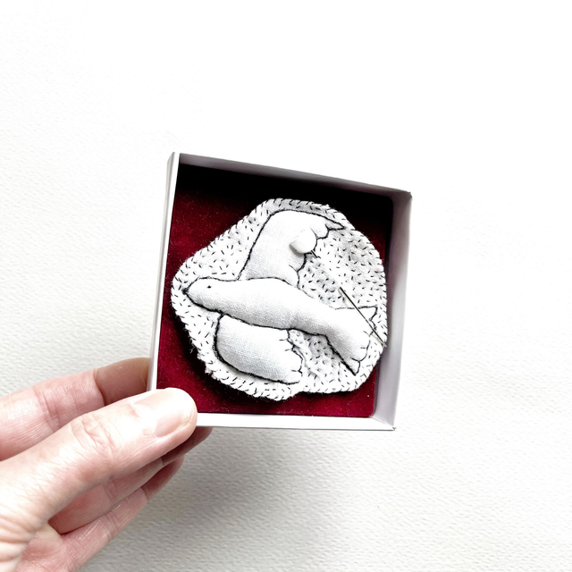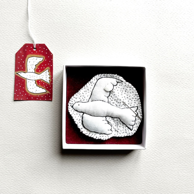 L’oiseau est brodé sur du lin blanc avec des fils noirs très fins. Il est légèrement rembourré pour lui donner un joli volume.