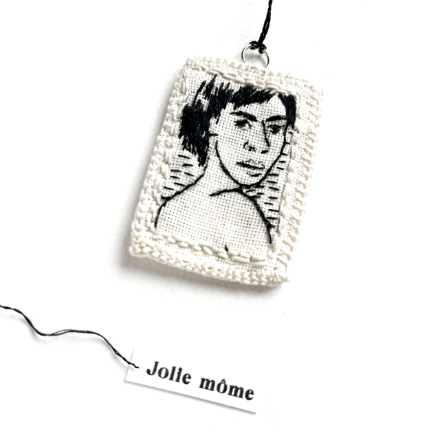 Les traits du visage sont soulignés avec du fil noir très fins : yeux, sourcils, nez, bouche. Des mèches de cheveux ainsi que les contours et le fond sont brodés avec du fil noir très fin.