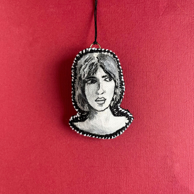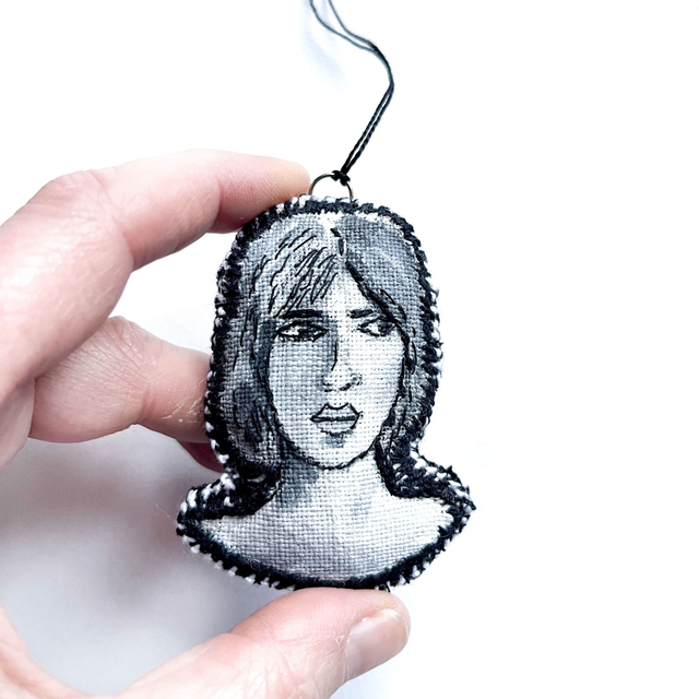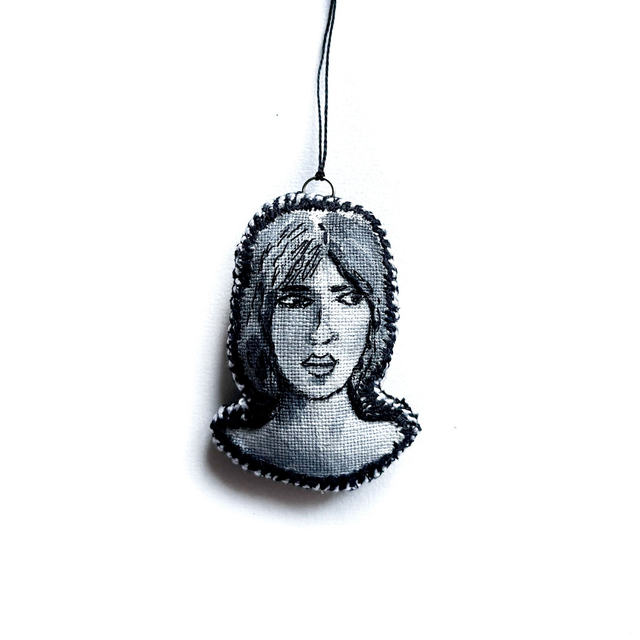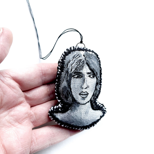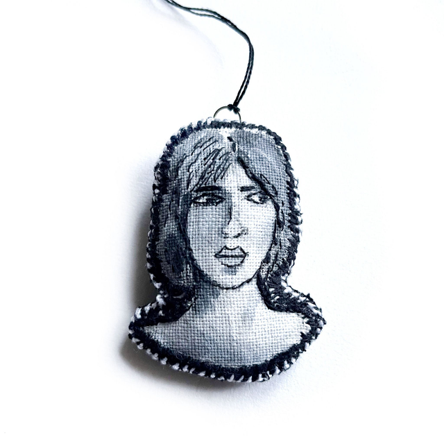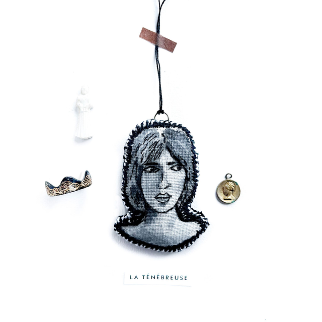 Les traits du visage sont soulignés avec du fil noir très fin : yeux, sourcils, nez, bouche. Des mèches de cheveux ainsi que les contours sont brodés avec du fil noir très fin.