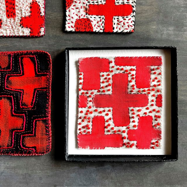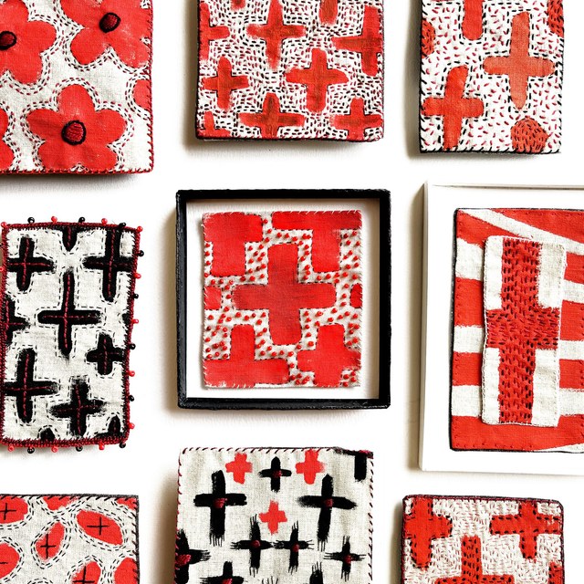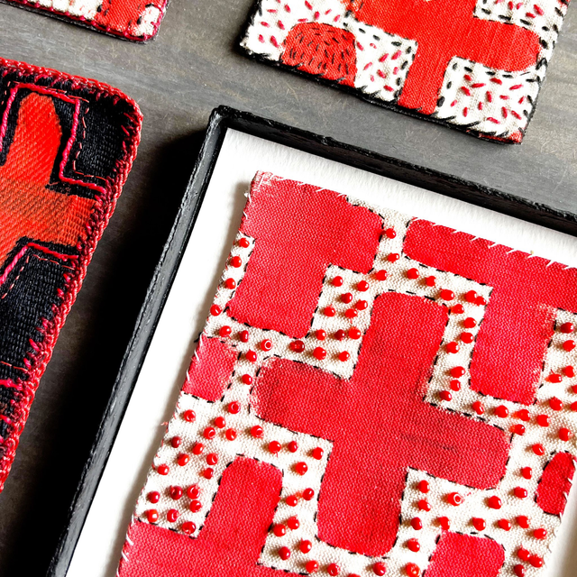 Petit tableau textile peint de croix rouges brodé sur les contours de fil noir très fin et rebrodé de perles rouges nuancées.