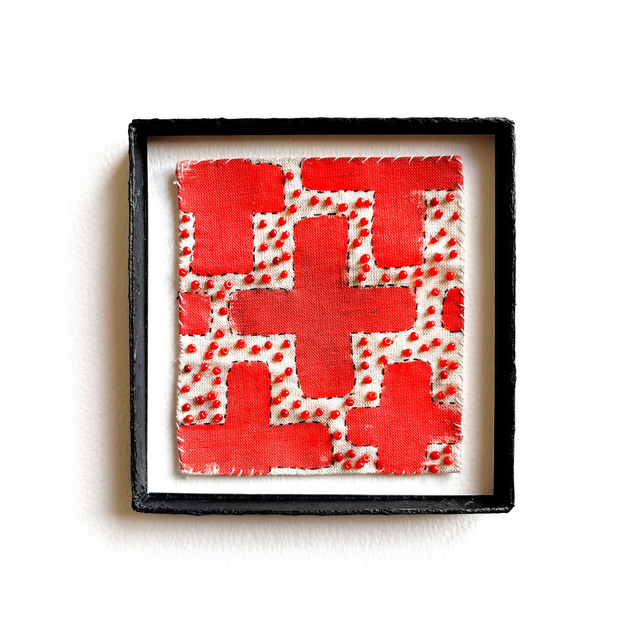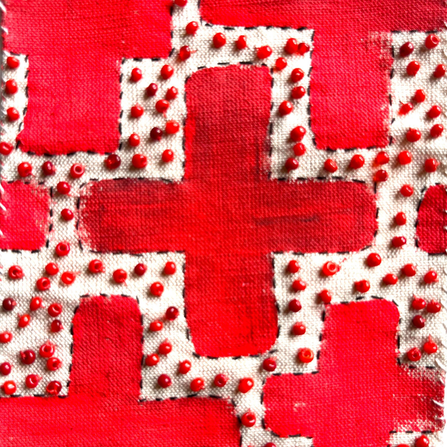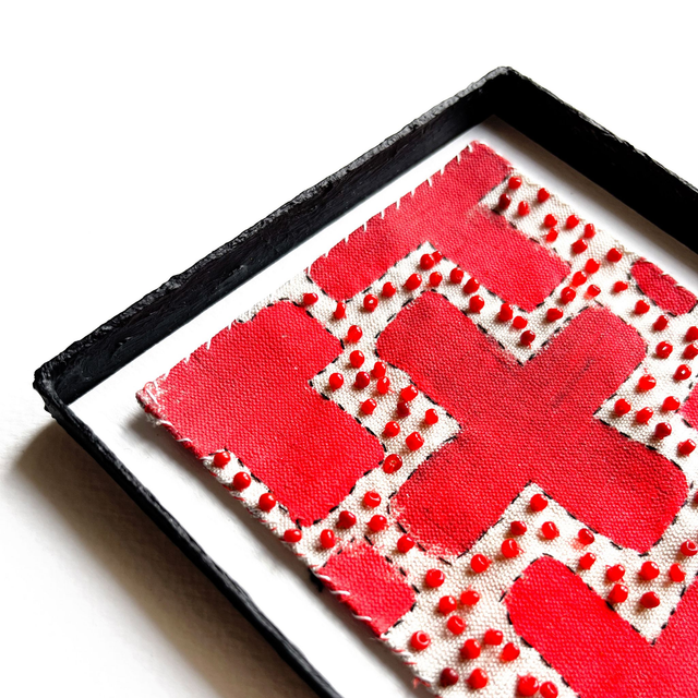 Petit tableau à motifs croix rouges, peint et brodé de perles