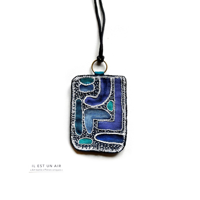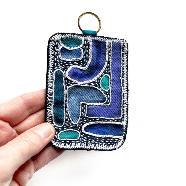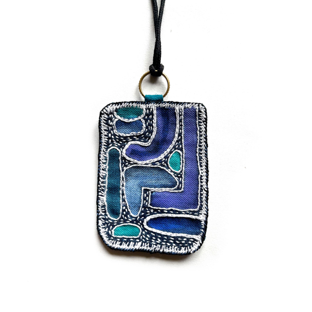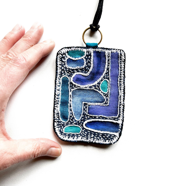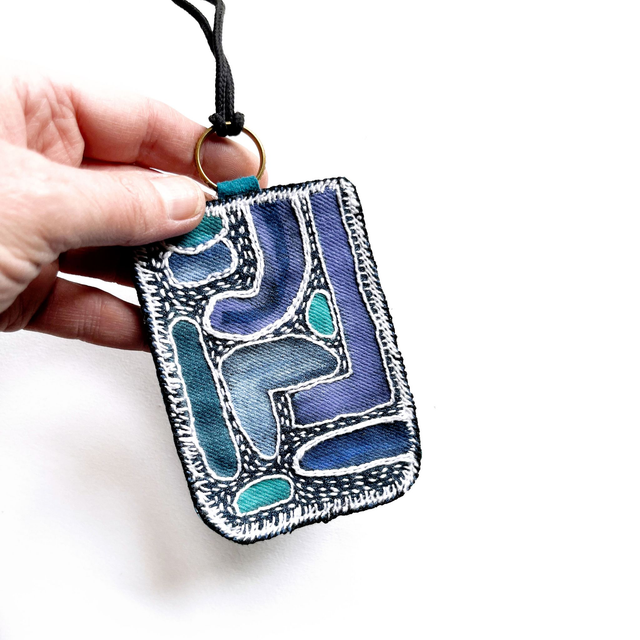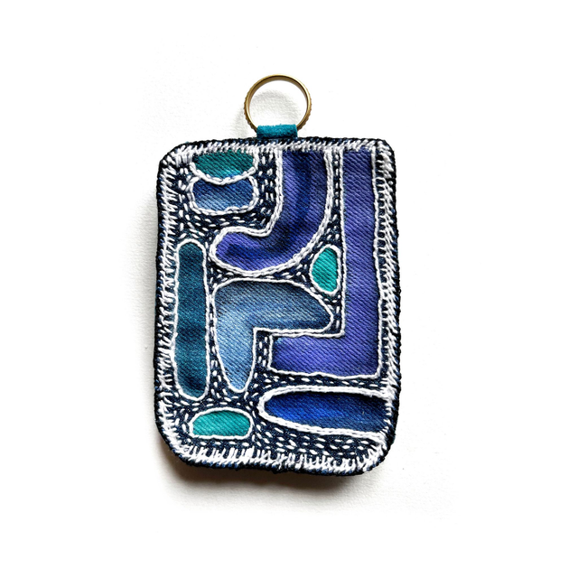 Petit tableau abstrait peint et brodé sur du jean dans des tons bleu, vert et turquoise.