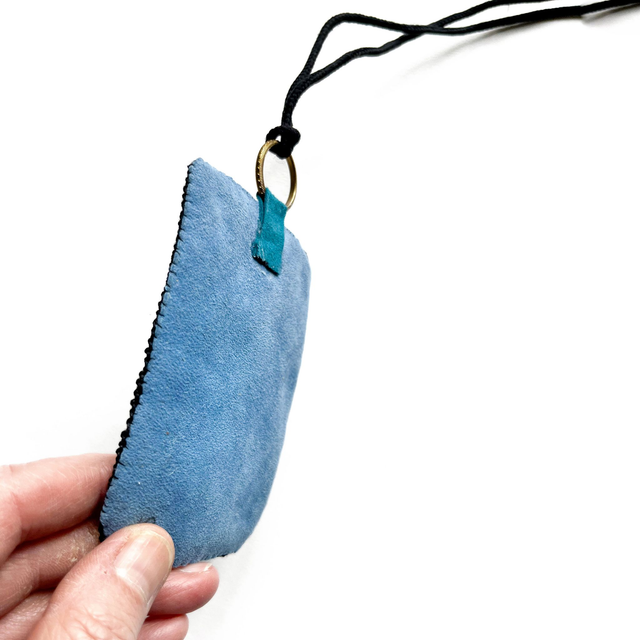 - Un anneau en laiton est fixé avec de l’alcantara vert turquoise.