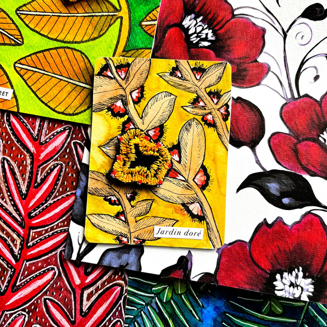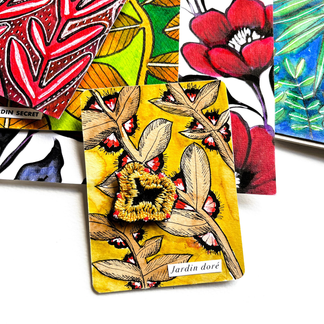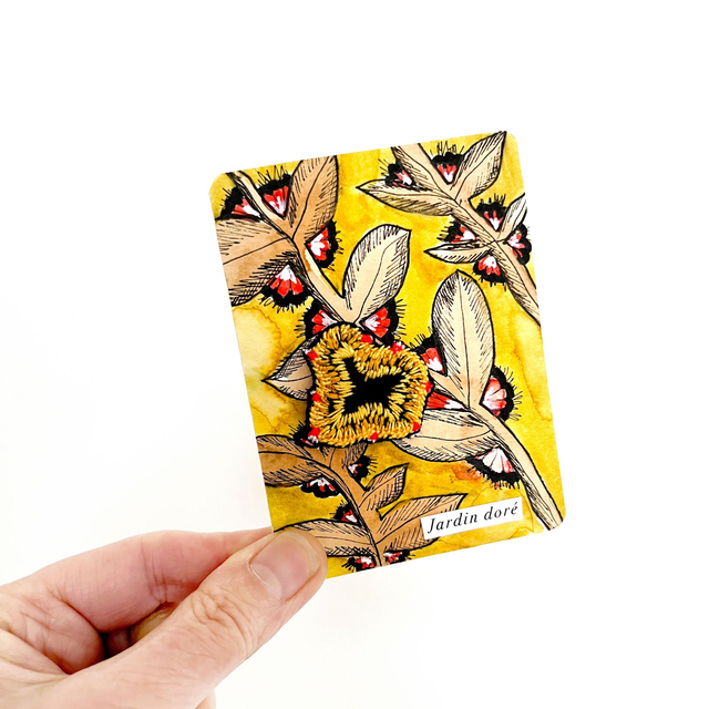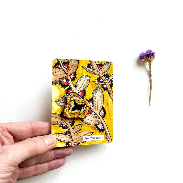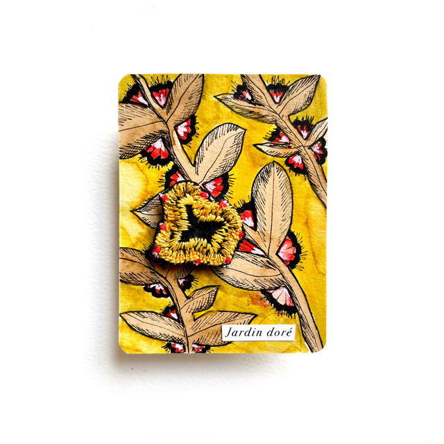 Illustration végétale associant motifs à l’encre et peinture, feutre et broderie. Ce dessin est original, ce n’est pas pas tirage imprimé. L’illustration est contrecollée sur un carton bois.