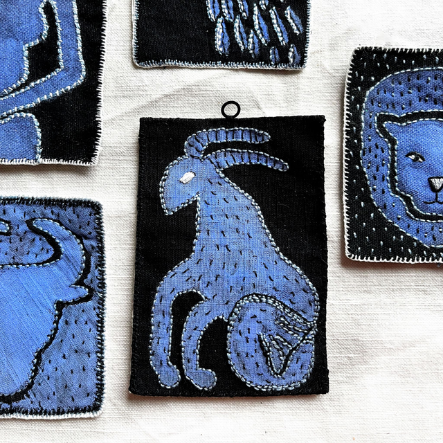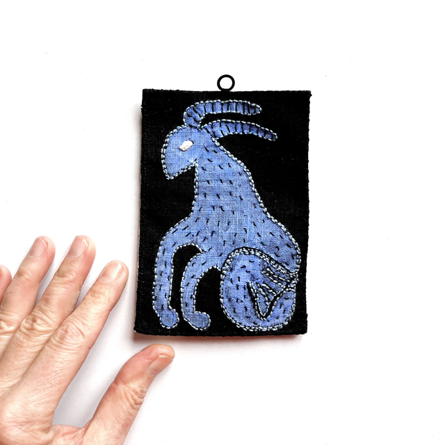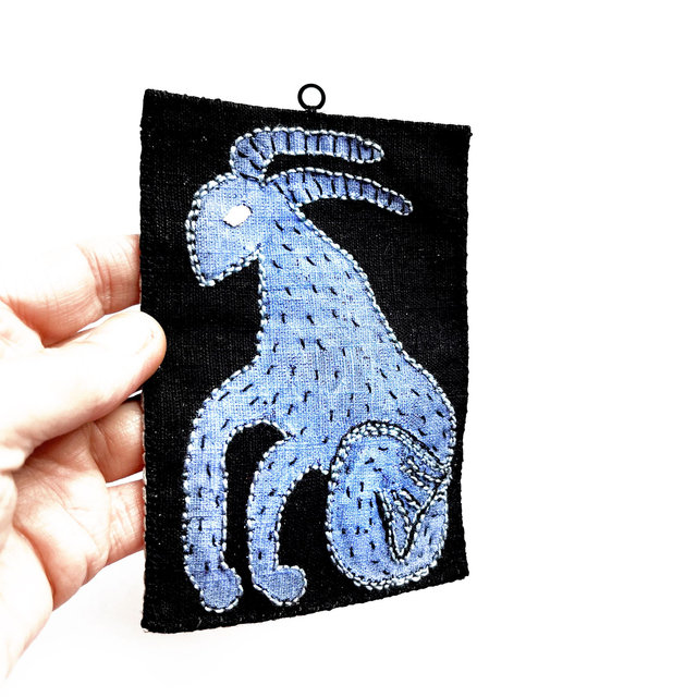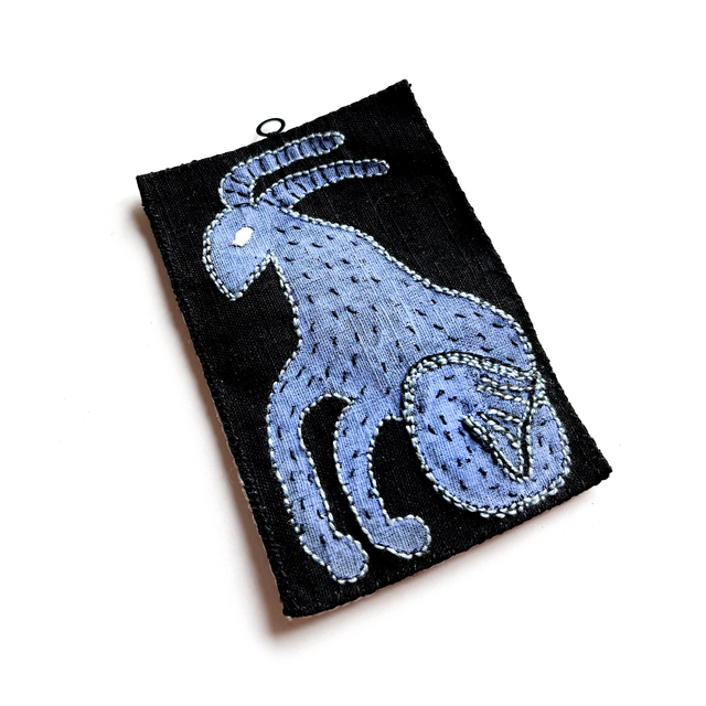 Petit tableau textile représentant le signe astrologique capricorne : le motif est peint sur du lin noir en bleu indigo. Il est ensuite brodé avec du coton perlé noir et gris/bleu.