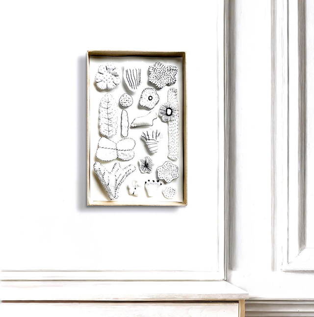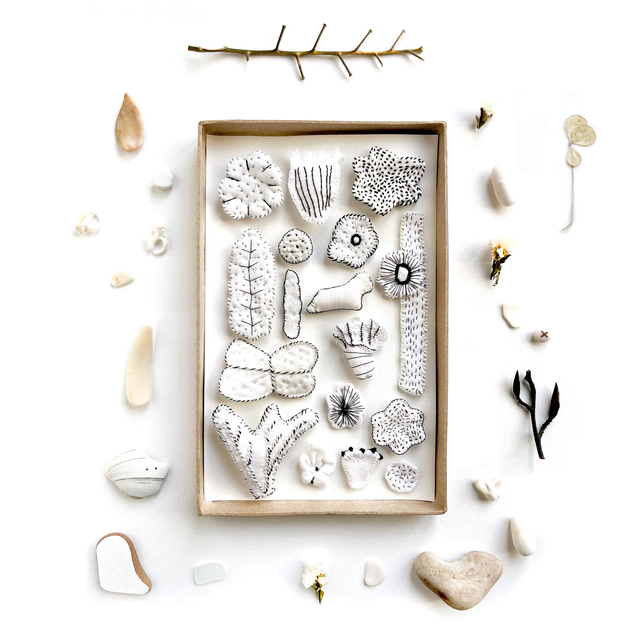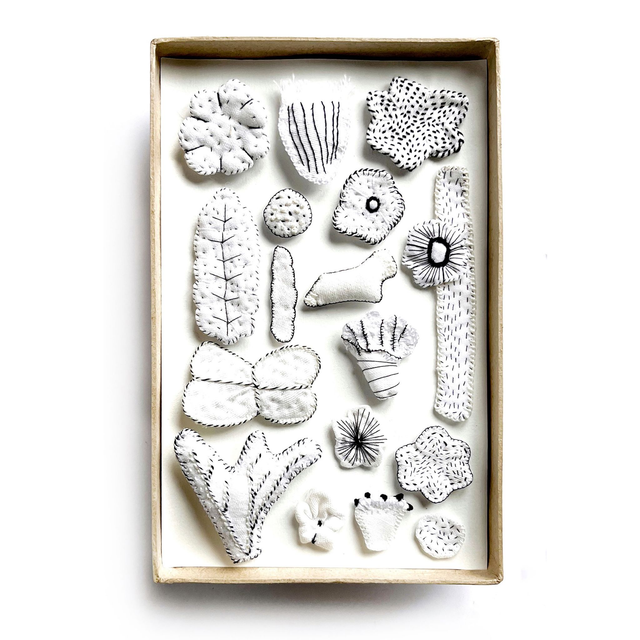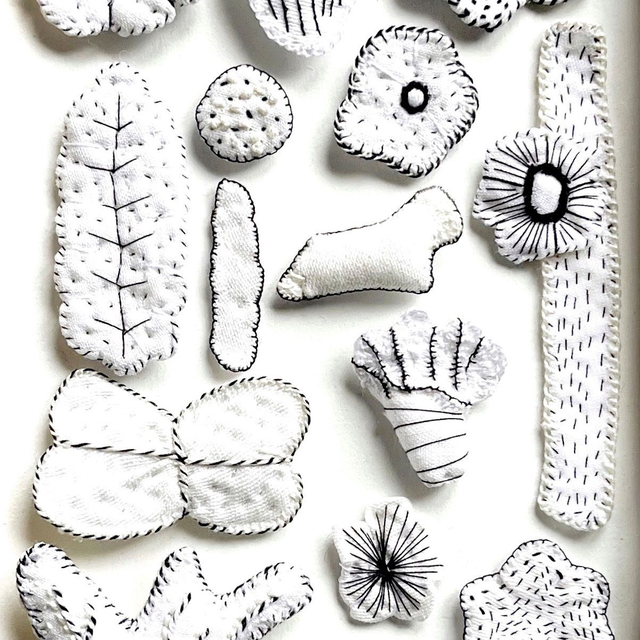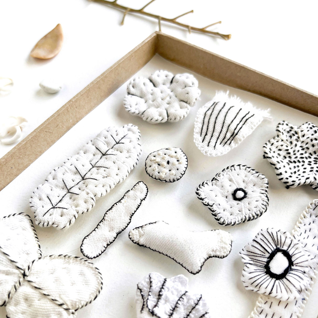 Tableau textile blanc, inspiré des cabinets de curiosités, avec une composition de 17 formes brodées, allant des fleurs délicates aux motifs organiques et abstraits.