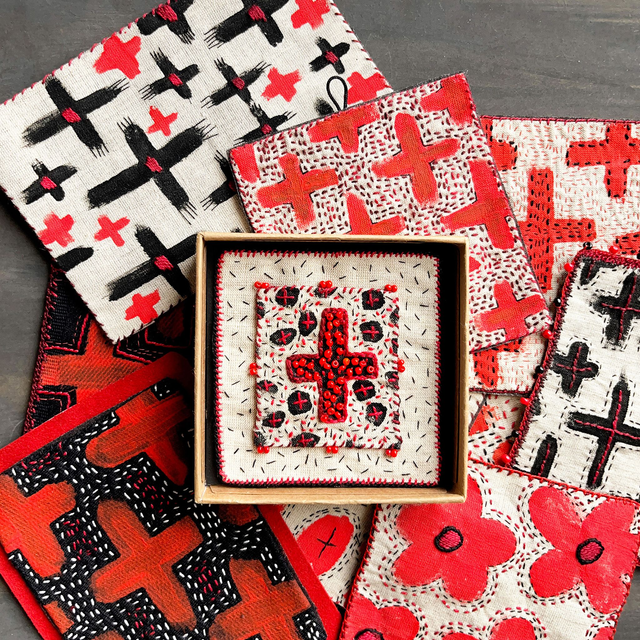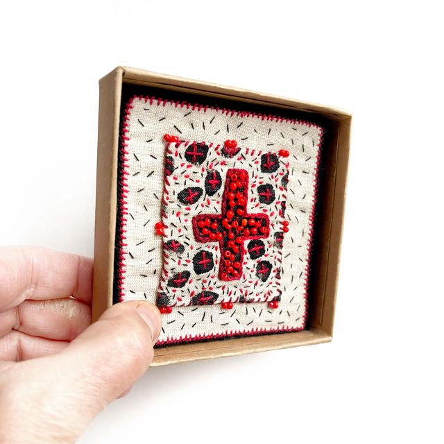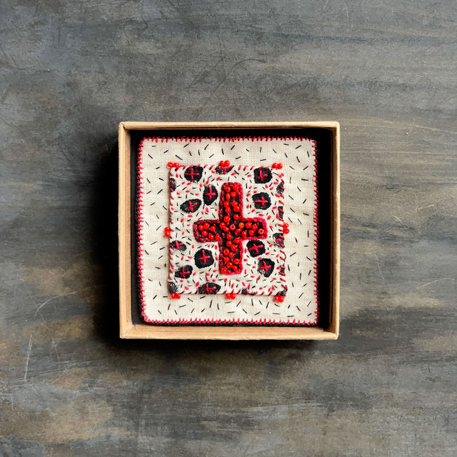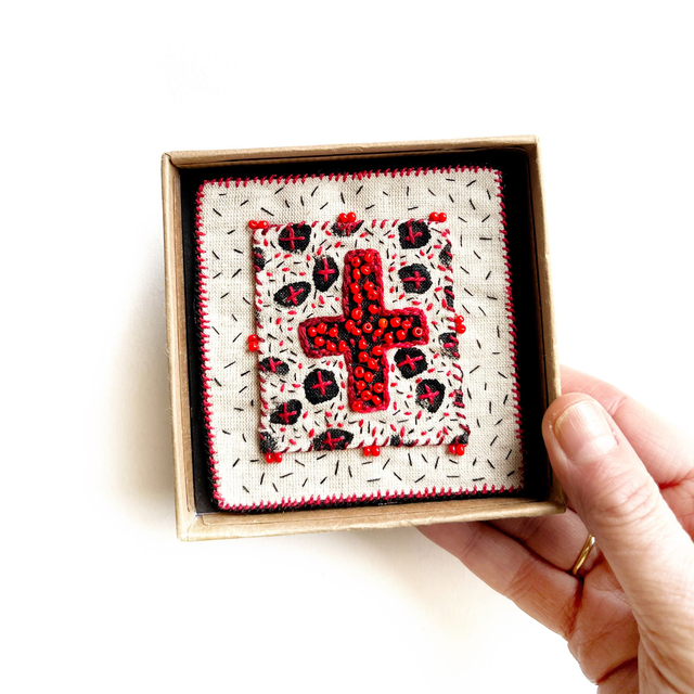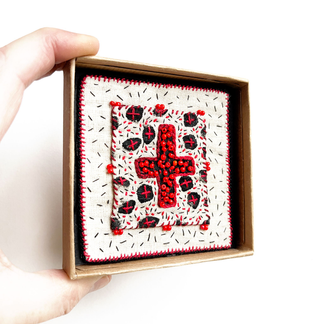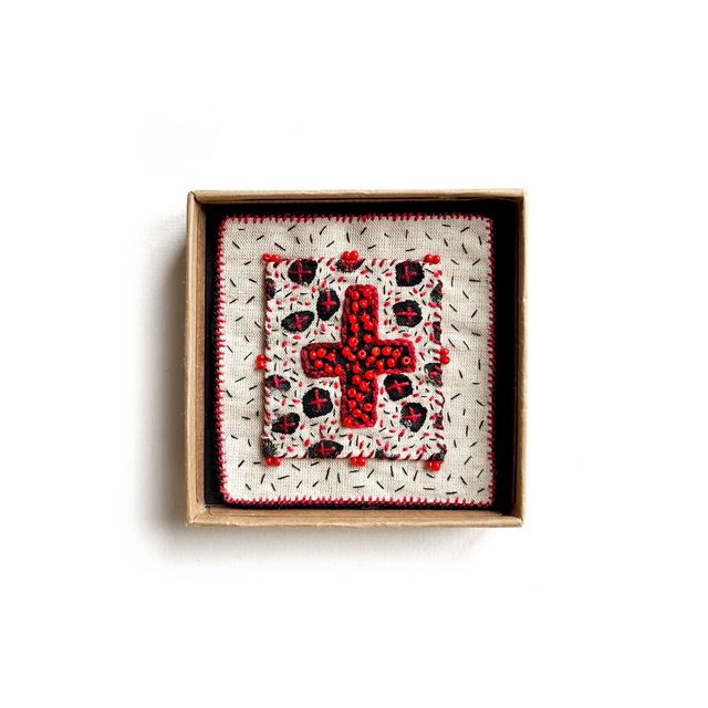 Tableau croix rouge porte-bonheur, richement brodé de fil et de perles