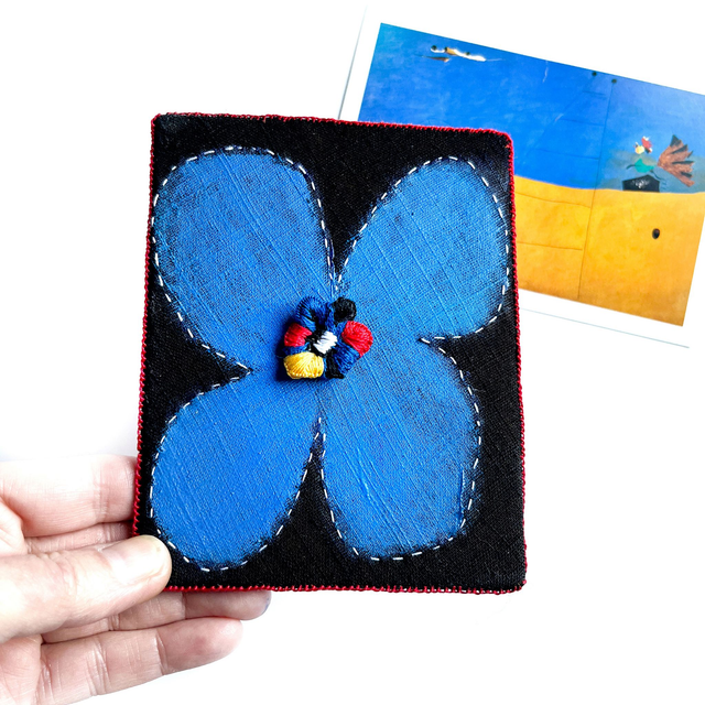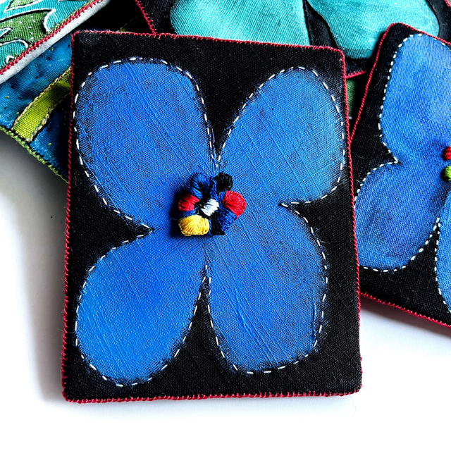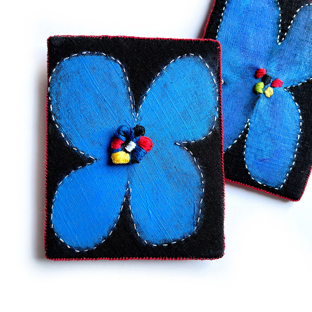 Petit tableau fleur bleue : la fleur est d’abord peinte sur une toile de lin noire, puis ses contours sont brodés et une broderie est appliquée au centre.