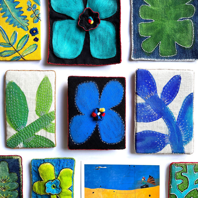 Toutes mes créations sont des pièces uniques, entièrement confectionnées à la main. Je dessine au préalable mes motifs sur mes toiles, applique la peinture, puis réalise la broderie.
