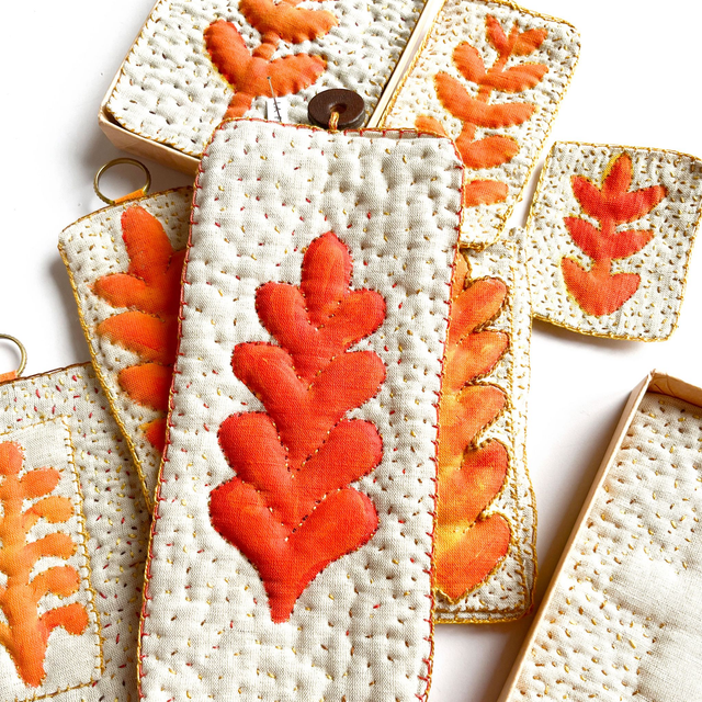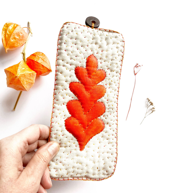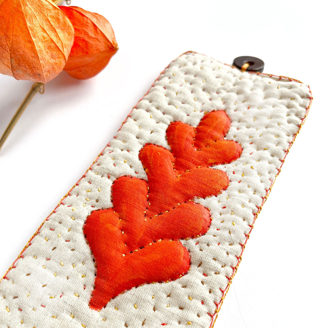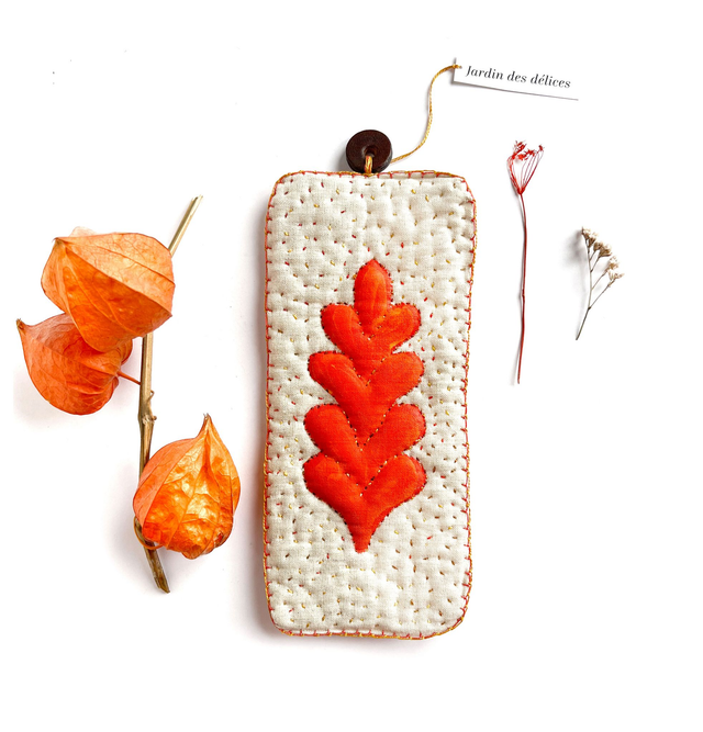 - Fils utilisés : coton perlé dans différentes nuances de jaune, d’ocre clair et foncé et d’orangé.