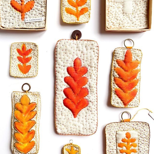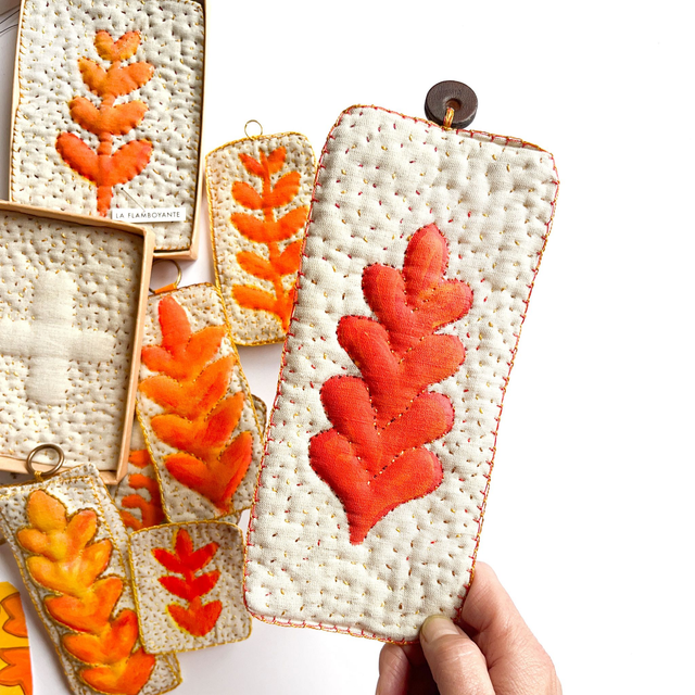 Tableau textile peint et brodé, branchage rouge en volume
