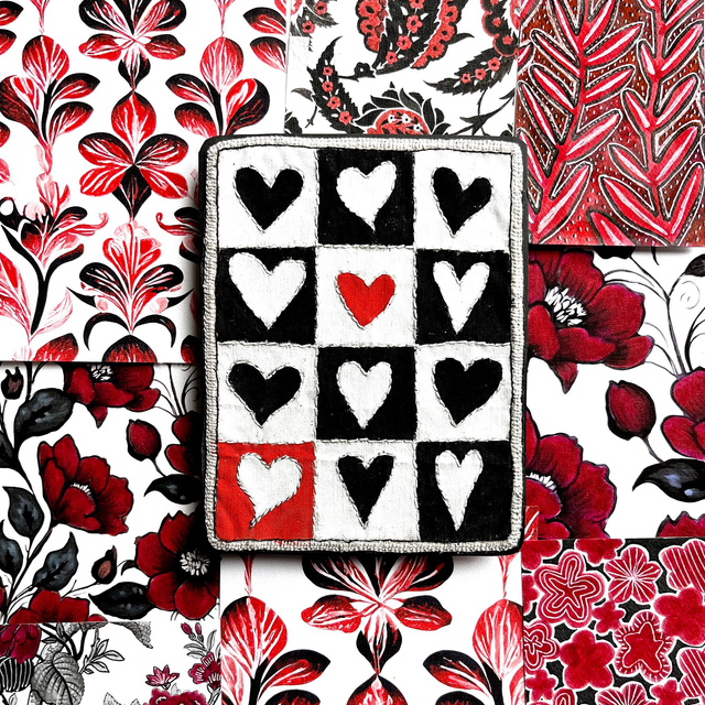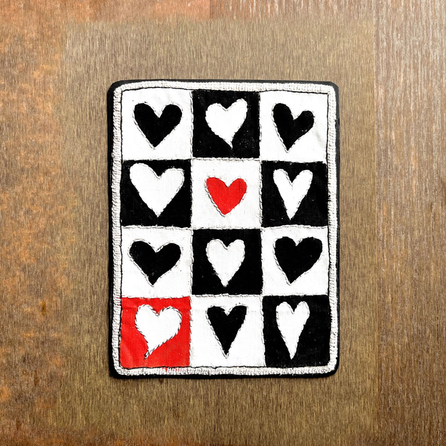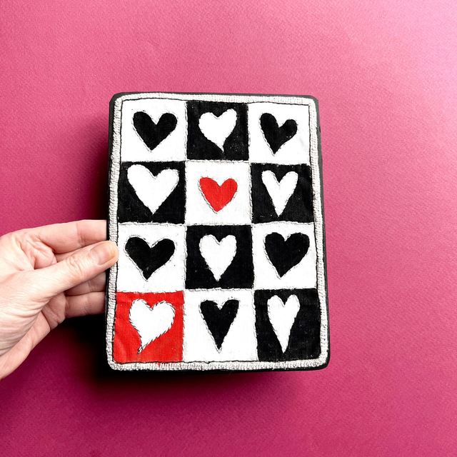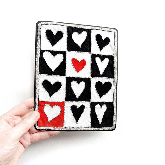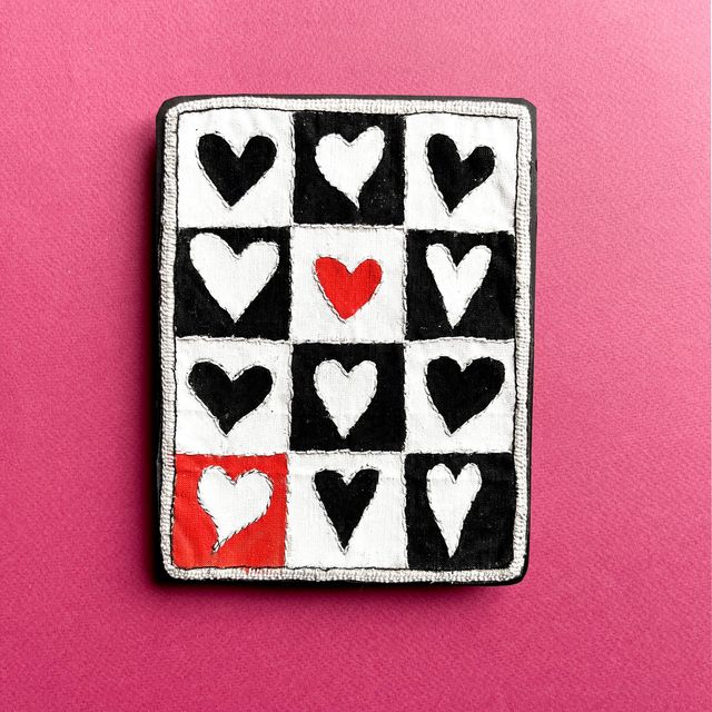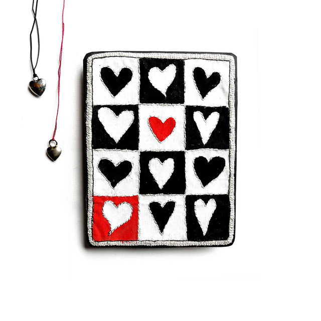 Tableau avec 12 cœurs peints noirs, blancs et rouges et disposés façon damier. Les contours de chaque cœur sont brodés ainsi que les séparations des cases.