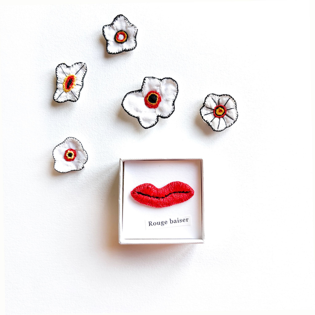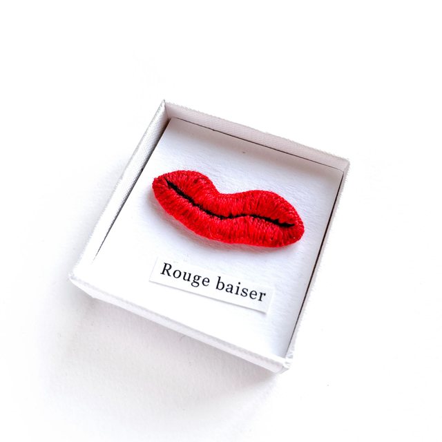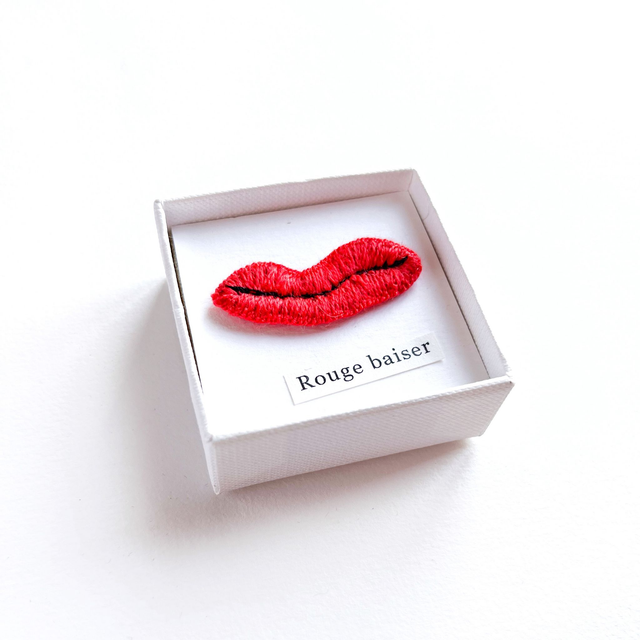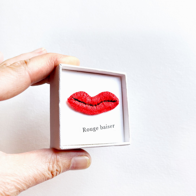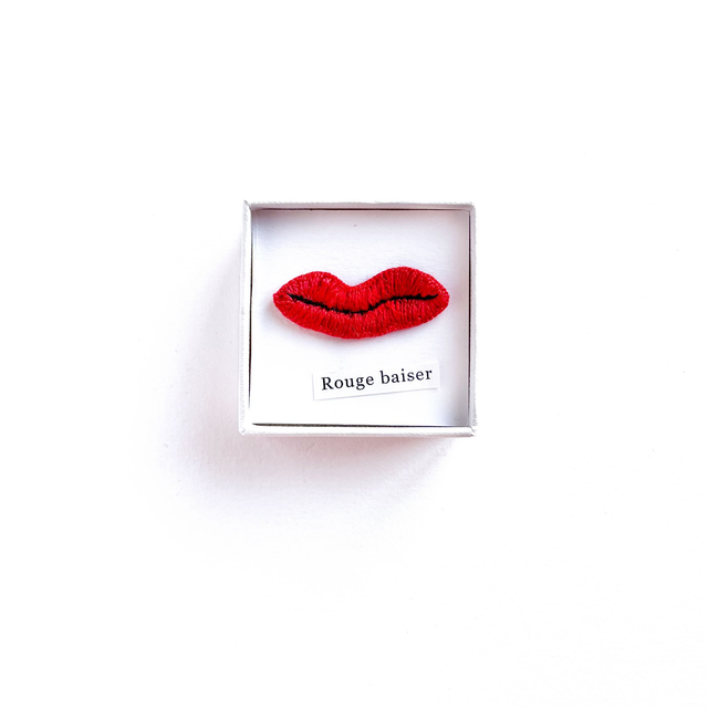 Bouche rouge brodée présentée dans petite boîte blanche